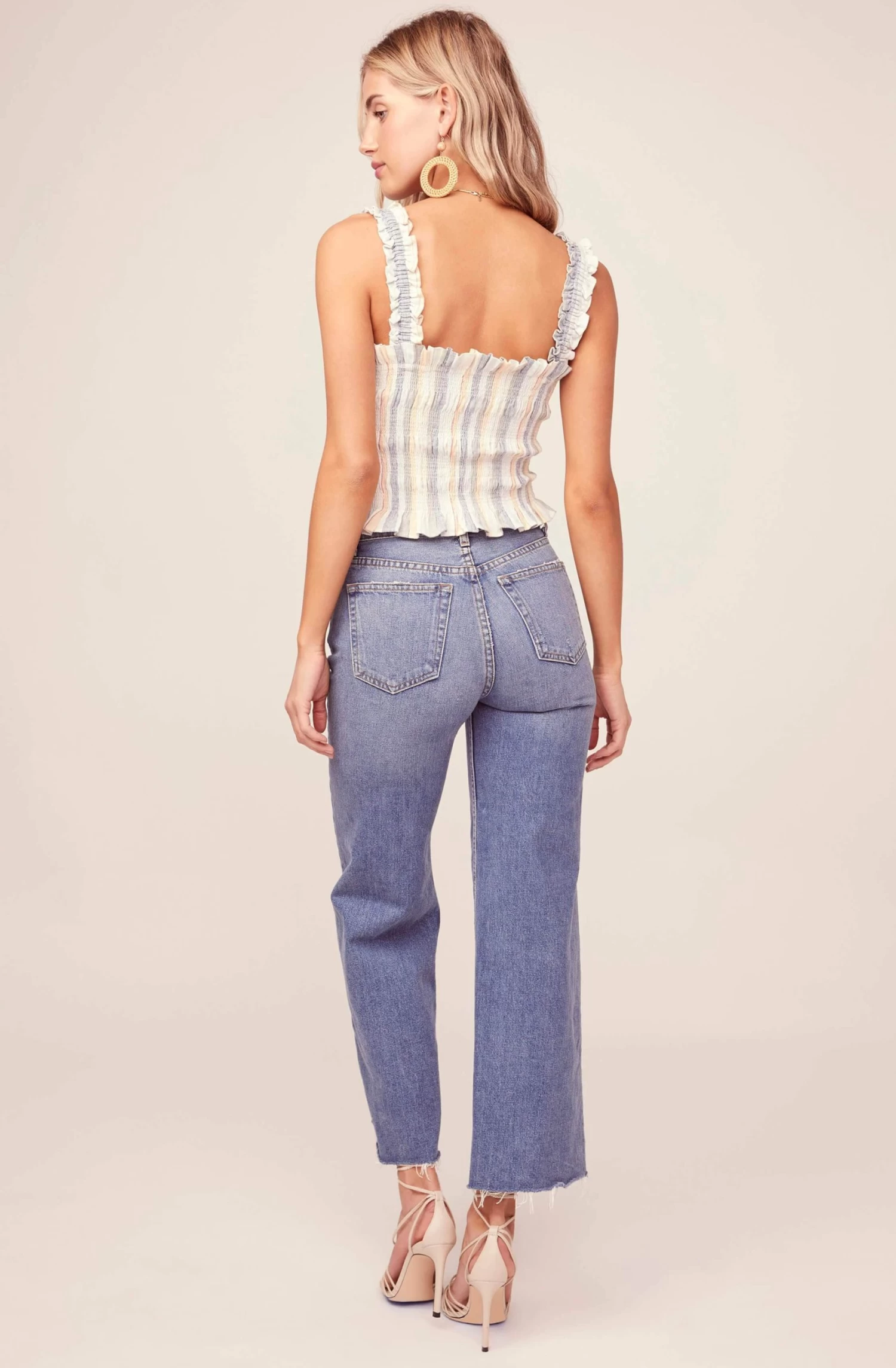 With this top in your summer arsenal, everything will be just peachy! Ruffle shoulder straps lead down to a square neckline. Smocked bodice and soft multi-stripe print is just what your afternoon beach look needs. Pairs best with jeans and strappy heels!