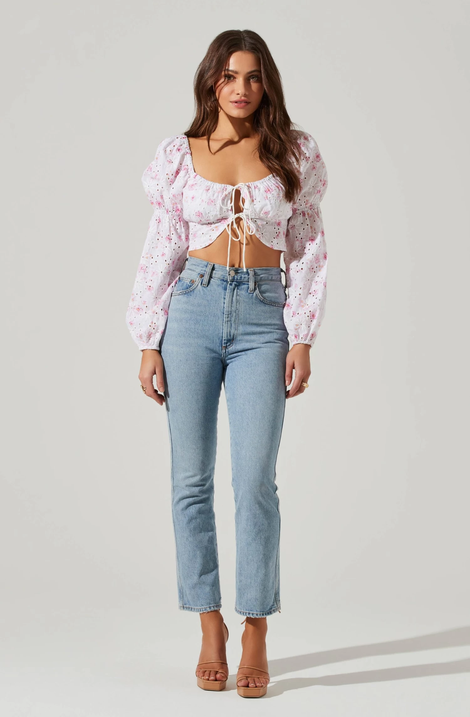 The Valo Top features a delicate floral print throughout on eyelet fabrication. Square neckline leads to a tie front. Cropped hem. Long sleeves. Smocked back.