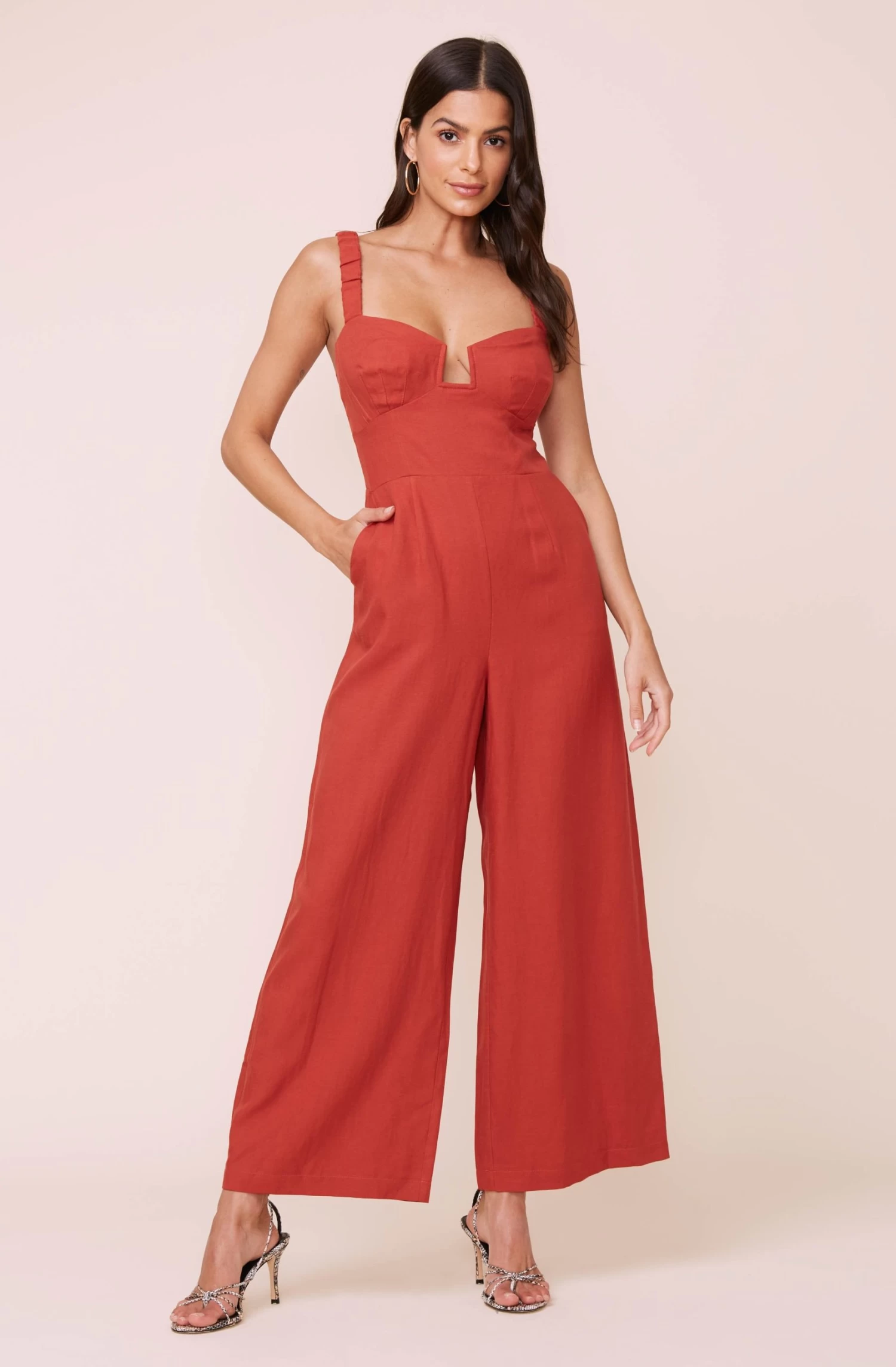 Make your move in the Versailles Jumpsuit. This chic one-piece wonder features a bustier bodice with a cutout accent, wide leg bottoms and low cut back. Slanted hip pockets.