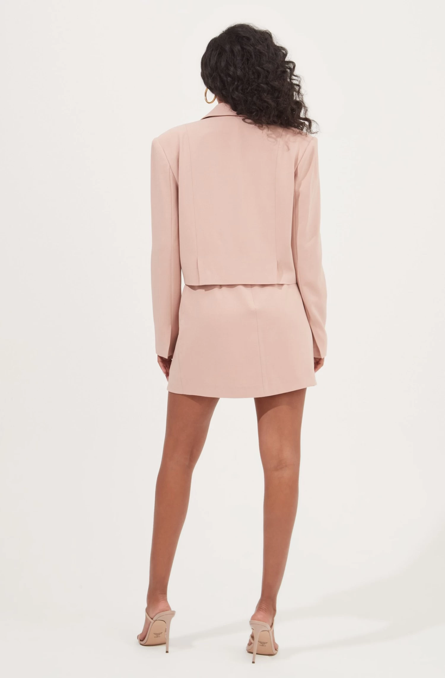 The Woodbury Blazer is the perfect complement to your wardrobe. It features a notched lapel that leads to a buttoned front. Darted waist. Pocket flaps. Long sleeves. Padded shoulders. Cropped hem.