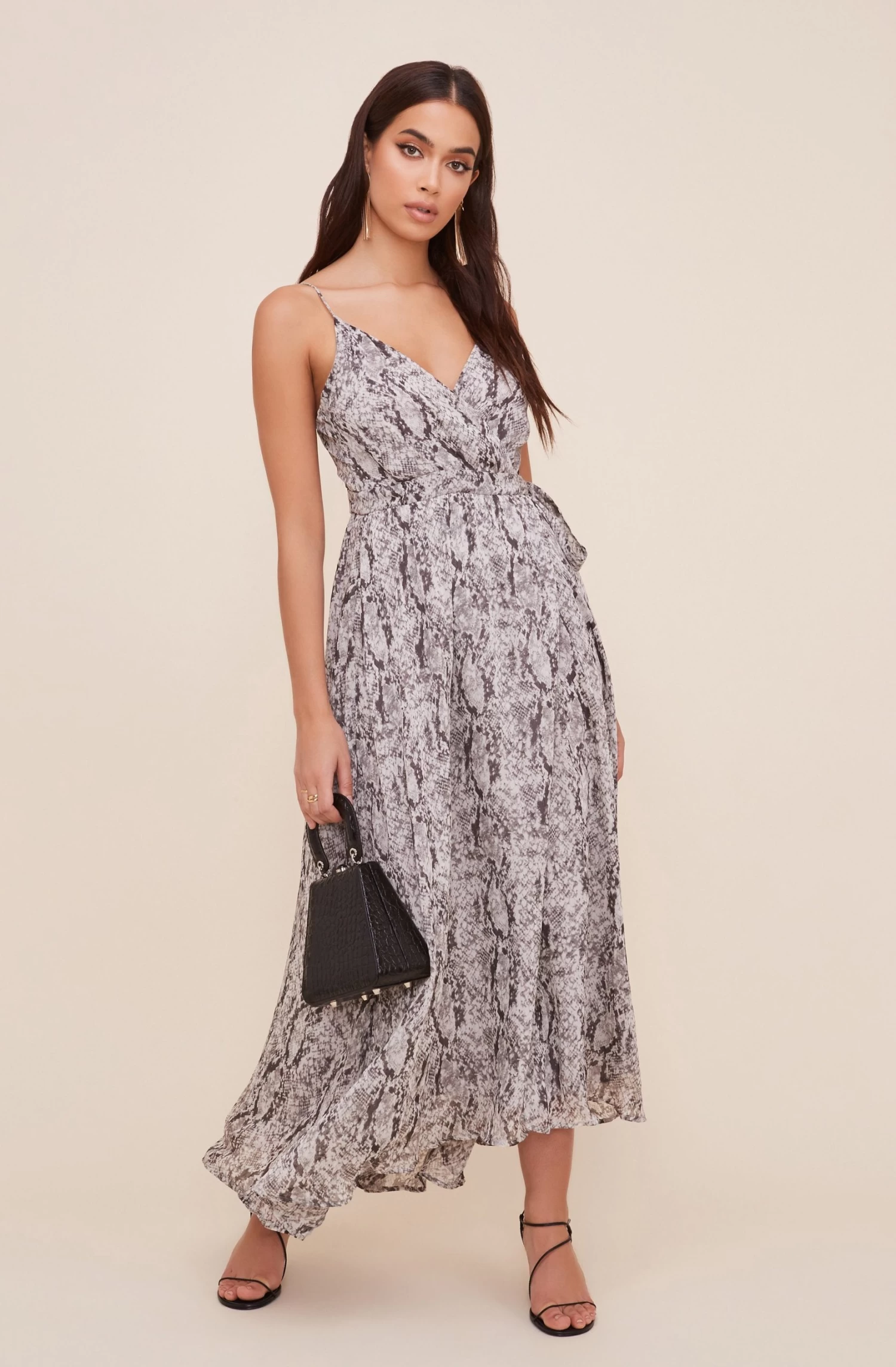 100% Polyester, Lining: 100% Polyester, Length: 53 1/2″ (Size M), Inside Button & Self Tie Closure, Dry Clean Only, Wrap, Maxi Dress, Python Print, Model is Wearing Size S, Model’s Measurements: Height 5’9″ // Bust 31″ // Waist 24″ // Hips 36″, Fits True to Size, Style#ADR100339B